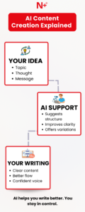 AI does not replace writers. It supports them. It helps you put your point across in the best possible way and when your ideas are combined with AI’s structure and speed, your content becomes stronger.